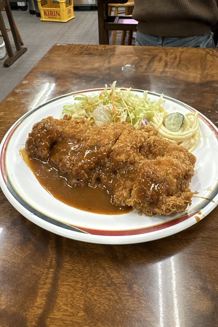 スポンサーリンク 最近の「金時食堂活動」(神戸・元町) 食堂 2025.12.23 1ヶ月ちょいぶりの「金時食堂活動」。申し訳ありませんが相変わらずのワンパターンですw まずは瓶ビール(650円)に、なすの煮たの(350円)。 毎度毎度の大好物・チキンカツ(730円)。 ちゃんと厚みがあってボリュームたっぷり。洋食屋さんさながらのソースもおいしいです。付け合わせも充実しているので、この一品だけで相当満足感あり。 ハイボール(500円)追加して、今回も大満足でした。 関連エントリ: 最近の「金時食堂活動」(神戸・元町) 最近の「金時食堂活動」(神戸・元町) 「高田屋京店」でまったり(神戸・新開地) 営業再開した「高田屋京店」(神戸・新開地) ちょい飲み三連発(元町・新開地・新長田)