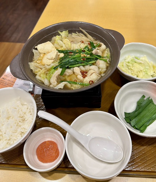 ほとんど考えることなく「博多明太もつ鍋あごだし醤油」のご飯付き(1290円)に、野菜が少ないと訊いていたのでキャベツとニラ(各100円)を追加しました。写真は運ばれてきてすぐの状態で、この後キャベツとニラ(少ない〜)はすぐ鍋に入れました。