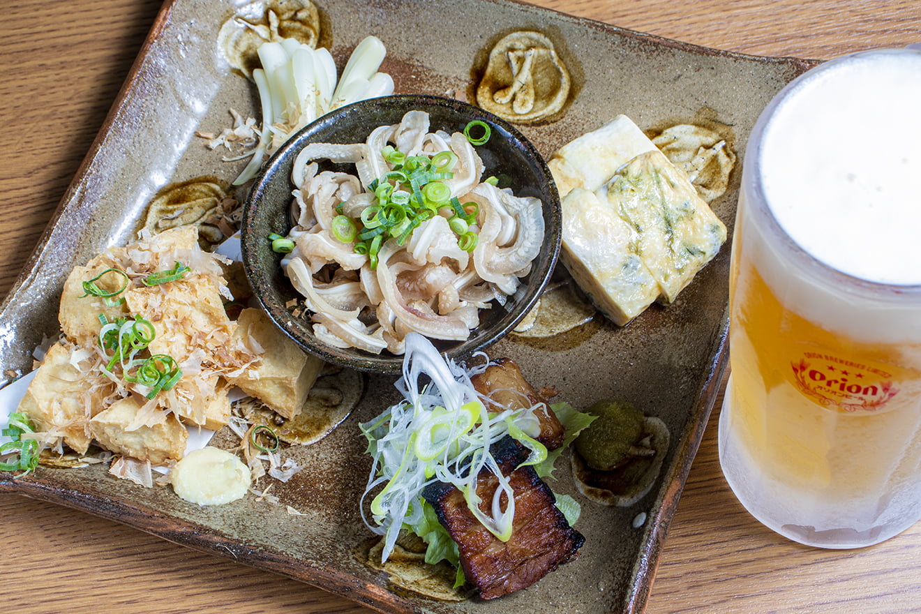 セットの続きは、島豆腐のちぎり揚げ・島らっきょうの塩漬け・アーサー入りだし巻き・ラフテー炙りと盛りだくさん。一人飲みだったらこのセットだけでも充分楽しめるし、あまり沖縄料理を知らない方にも良さそうです。