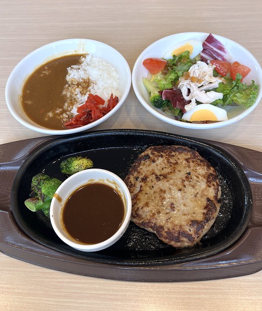 平日昼間となれば選択はやはりガストFITメニュー2。3品コースではなく4品コースを選び、ミニカレー+蒸し鶏とケールのサラダ+FIT!デミハンバーグに、食後のデザート。