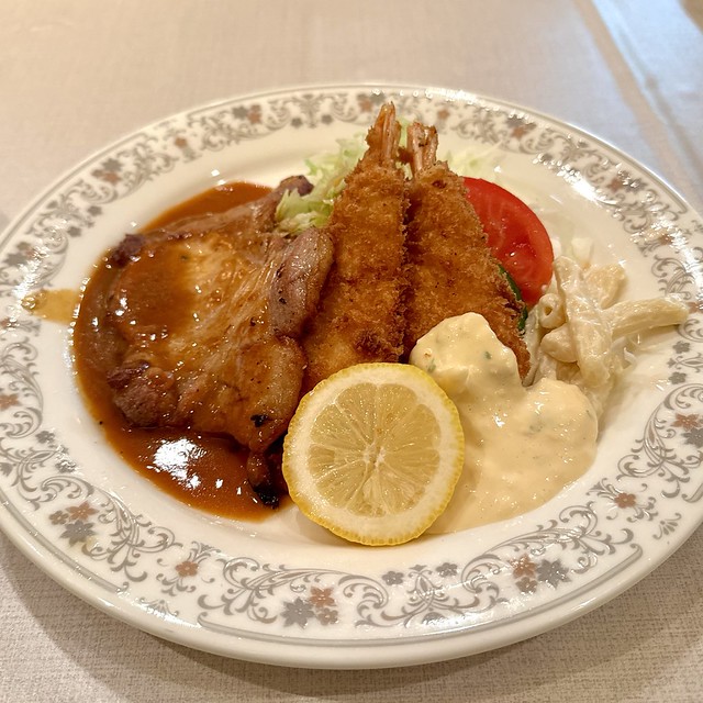 選んだのはポークステーキにエビフライ2尾のAランチ(1150円)。ハンバーグとエビフライにしようかと思ったけれど、あまりにフツーなんでこっちにして良かったです。