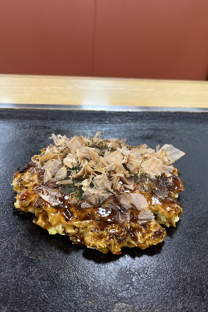 意外だったのが、お好み焼のベースの生地。軽めに熱を加えているのか、キャベツが少ししゃきっとクリスピーで、それがとても良いんです。キャベツの切り方が千切りではなく粗めのみじん切りなのも歯ざわりがいい要因かと。そのかわりキャベツの甘みは欠けるけど、これはこれでありだと思います。