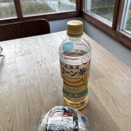 昨日から北海道にきています。白老のドミトリーにて、朝ごはんはコーン茶とセイコーマートの塩さばお握り。デカいです。